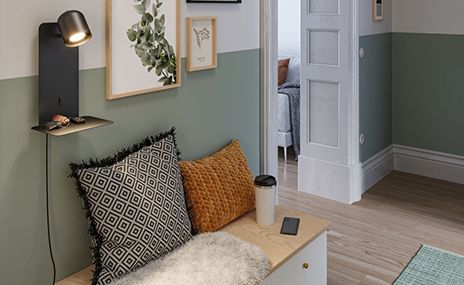 Tip: Med dæmpbare belysningsløsninger kan rummet tilpasses efter tidspunkt på dagen og humør. Armaturer med CCT-funktion (korreleret farvetemperatur) giver også fleksibilitet med hensyn til atmosfære, da de gør det muligt at ændre farvetemperaturen fra varmhvid til dagslys-hvid. For eksempel kan en aktiverende og koncentrationsfremmende universalhvid bruges til lektier, mens de hyggelige aftentimer nydes bedst med varmhvidt lys.