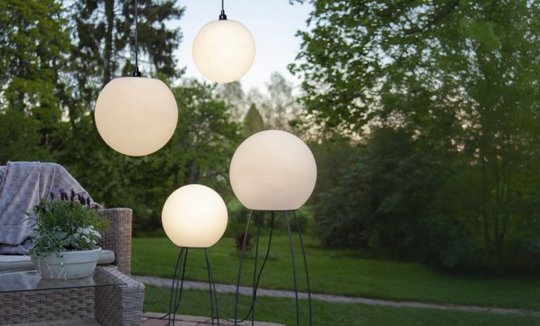 Varm lysdekoration til stier, enge og træerSfæriske lamper fås som sti-, stolpe- og væglamper til havestier, husfacader og indgangspartier. De gør deres store entré som varme, dekorative lys på græsplæner og blomsterbede, i træer og buske eller på balkoner og terrasser - som gulvlampe med globe, hængende globelampe eller jordspyd med globe. Flydende kugleformede lamper med en ekstra høj kapslingsgrad fås også til sommerhaven og kan bruges hele året rundt - selv i regn, frost eller sne.