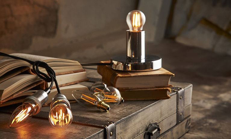 Den perfekte måde at skabe vintage-charme påNår det gælder vintage, er Edinsons pære et must - men i en moderne og energieffektiv version med moderne LED-teknologi: som glødelampe! Vintage-skærme af glas, tekstil, træ eller keramik skaber endnu mere nostalgisk flair og atmosfære. Tip: Selv med en simpel fatning kan der skabes en ren atmosfære takket være glødelamper.