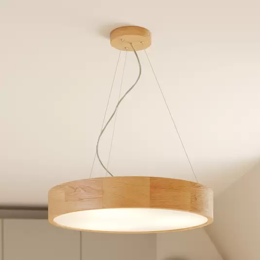 Kerio rund hængelampe af egetræ og satineret glas Skærmen på Kerio hængelampen består af en ramme af egetræ og satineret glas, som sender lyset opad og nedad uden at blænde. En stilfuld lampe til den moderne bolig.