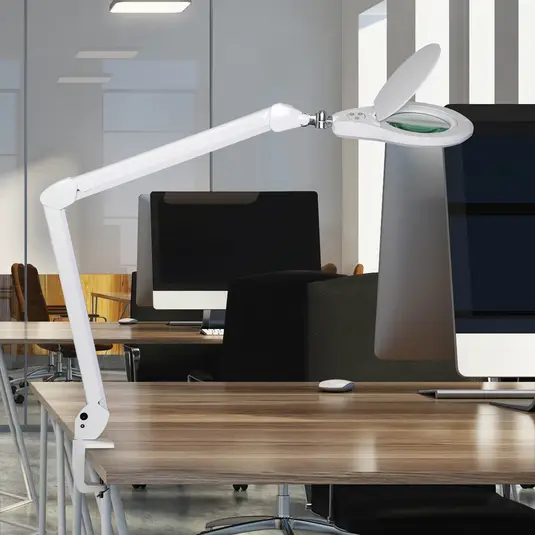 Dæmpbar LED-forstørrelseslampe MAULsource MAULsource er en forstørrelseslampe, der giver ensartet og skyggefri belysning takket være de ringformede LED'er i lampehovedet. Takket være den overdækkede parallelogramarm er den robust og kan justeres fleksibelt. Til præcist arbejde i værksteder, kontorer, laboratorier, lægepraksisser eller i hjemmet giver den ikke kun lys, men forstørrer også op til 1,75 gange takket være 3-dioptri-linsen. LED'erne udsender lys i lysfarven dagslys, hvis lysstyrke kan justeres ved hjælp af den integrerede dæmper. Klemmebasen af plastbelagt metal med en klemmebredde på op til 6,3 cm gør det muligt at fastgøre den tredimensionelt justerbare lampe næsten overalt - Belysningsstyrke: 2140 lux i en afstand af 35 cm
