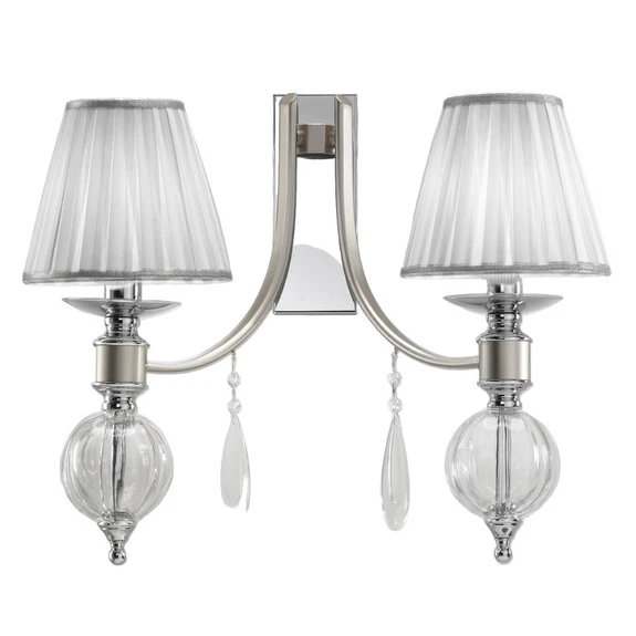 Med denne toflamme, smukke og elegant designede væglampe kan du opnå meget hyggelig og indbydende accentbelysning i stuer og soveværelser såvel som i gange og gange. Lyset udsendes opad og nedad og undslipper også rundt omkring gennem de to samlede nuancer lavet af hvidt stof. Det sætter også den forkromede stel og de klare glassmykker i rampelyset.