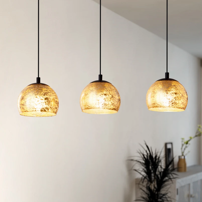 Lysene er fastgjort til stålbjælken af høj kvalitet i samme højde og jævnt fordelt. Det sorte farveskema og de lige linjer skaber lampens moderne og minimalistiske udseende. Lampeskærmens gyldne glas sætter derimod ædle accenter og diffunderer varmt lys.
