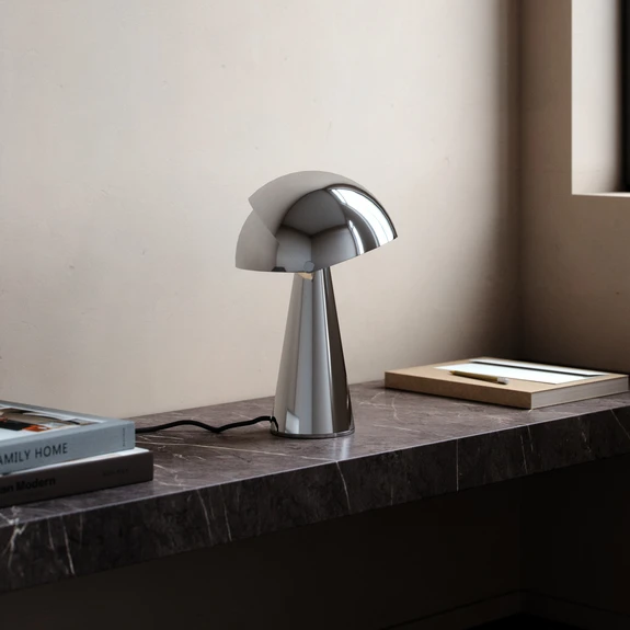 Svampeformet Align-bordlampe med foldbar skærmTo skærme placeret oven på hinanden og en kegleformet fod udgør grundstammen i Align-bordlampen, som er designet af Maria Berntsen. To messingfarvede skruer sikrer, at den store skærm kan vippes. På den måde forstørres lysudbyttet, samtidig med at det udgør Align-bordlampens hovedfokus. Skærmen er helt i metal, reflekterer udelukkende lyset nedad og giver en smuk, omgivende belysning i opholds- eller soveområdet. En vippekontakt er fastgjort til forsyningsledningen.