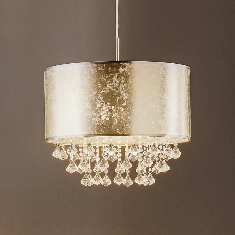 Pendellampen Amy med tekstilskærm i sølvmetallic med smarte vedhæng - et stilfuld højdepunkt for luksuriøse øjeblikke