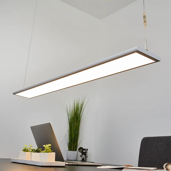 Hvid Samu LED-kontorhængelampe med direkte-indirekte lysudsendelse og varmhvidt lys Samu-kontorhængelampen integrerer dæmpbare LED'er, så lysstyrken kan justeres ved hjælp af en ekstern dæmper. Den giver også en belysning, der er rettet mod skærmarbejdspladser, da lyset udsendes direkte og indirekte med 60 procent af lyset rettet nedad og 40 procent opad. Kombinationen af direkte og indirekte lysudstråling sikrer et særligt ensartet lysmønster og maksimal aflastning af øjnene, så man kan koncentrere sig om sit arbejde på kontoret i lange perioder.