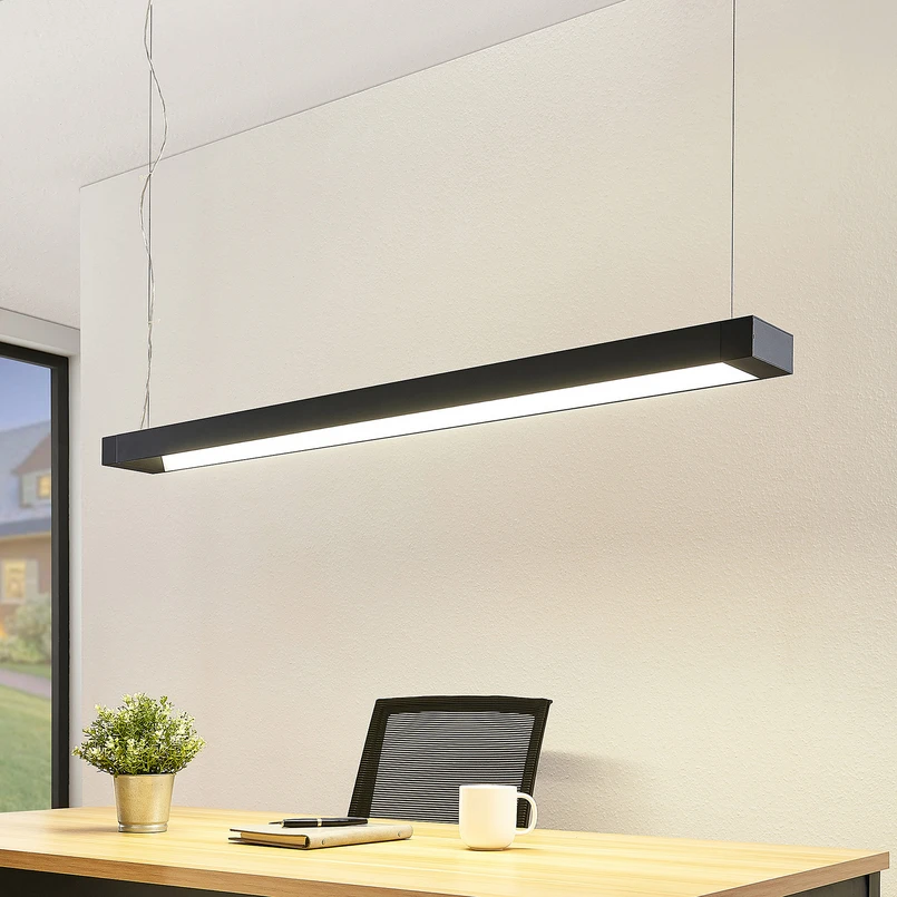 Cuna LED-kontorpendellampe med sort overflade og rektangulær form Cuna er en LED-pendellampe, der giver et stærkt lys og oplyser arbejdsområder godt. Lysfarven er universalhvid, hvilket er særligt behageligt for øjnene, når man arbejder, og reducerer træthed. Den aflange ramme på lampekroppen er sortmalet og har en kantet form. Lyset fra LED'erne udsendes i en vinkel på 120°. Tekniske data: - 120° strålevinkel - universalhvid lysfarve - IK03 slagfasthedsklasse - SDCM < 5 - mulighed for gennemfortrådning