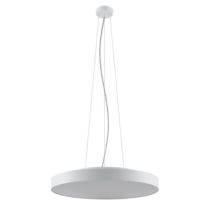 Rund LED-pendellampe Vanida i hvid - perfekt som køkkenbelysning Designet på Vanida LED-pendellampe er enkelt og moderne, men ekstremt stilfuldt, så det er altid en god anbefaling at vælge denne pendellampe, når det gælder belysning af opholds- og spiseområder. Lyset sendes hovedsageligt nedad, men også opad i mindre grad. Det får lyset i omgivelserne til at fremstå mere naturligt og ensartet. LED'erne har også en god lysstyrke og et lavt forbrug, hvilket betyder, at de er meget effektive i overensstemmelse med moderne krav. LED-pendellampen hænger ned fra loftet i slanke ledninger, som sammen med den hvide finish giver den et udtryk af lethed - ja, armaturet ser næsten ud til at svæve.