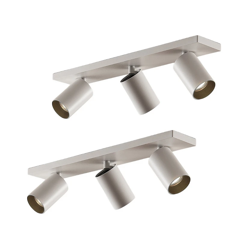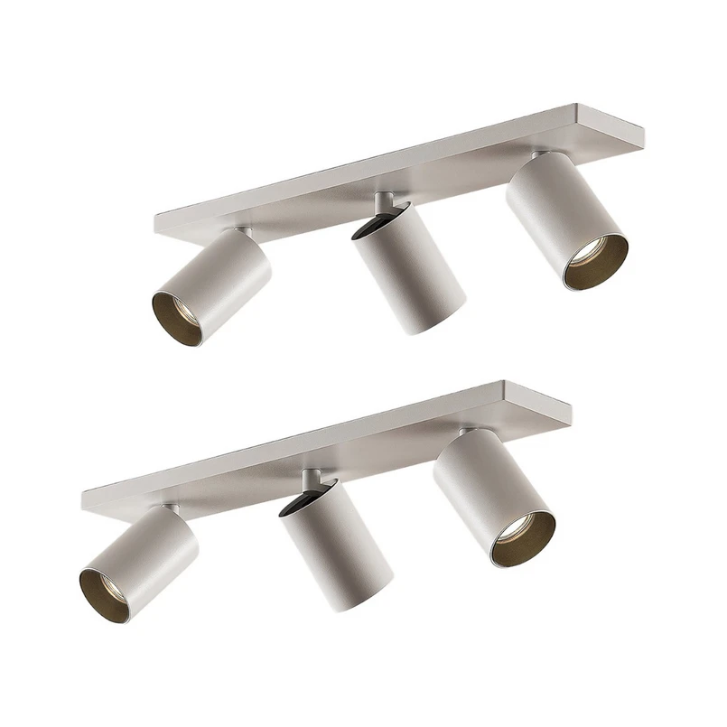 Hvid Brinja-spotlight af aluminium i 2-pak Den hvide Brinja-lampe af aluminium i høj kvalitet består af tre cylindriske spotlights, som alle kan vippes 90 grader og drejes 350 grader. Spotlightsene er monteret på et rektangulært beslag, som kan sættes fast i loftet eller på væggen. De tre kraftige spotlights kan også bruges til at belyse store rum optimalt. Da spottene kan drejes separat, kan de pege i forskellige retninger efter behov og dermed belyse forskellige områder i rummet. I dette tilbud kan Brinja købes som en dobbeltpakke.