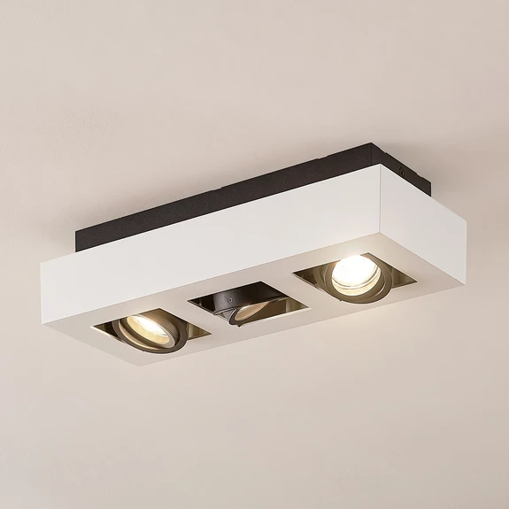 3 lyskilder Vince loftlampe med et lineært design og vippende spots Den rektangulære Vince loftlampe har et moderne udseende og et stilfuldt farveskema. Mens metalhuset er designet i hvidt, har lyskilderne fået en sort indramning. Det enkle design kan ikke kun bruges i private rum, men kommer også til sin ret i kommercielle områder. De tre GU10-fatninger kan udstyres med holdbare LED-lyskilder og kan også vippes efter ønske. Denne fleksibilitet i lyskilderne er en reel fordel, når det drejer sig om at fremvise bestemte genstande på en smuk måde - Med skrueløs hurtigkoblingsklemme af høj kvalitet (holdbar, sikker og værktøjsfri fjedermekanisme)