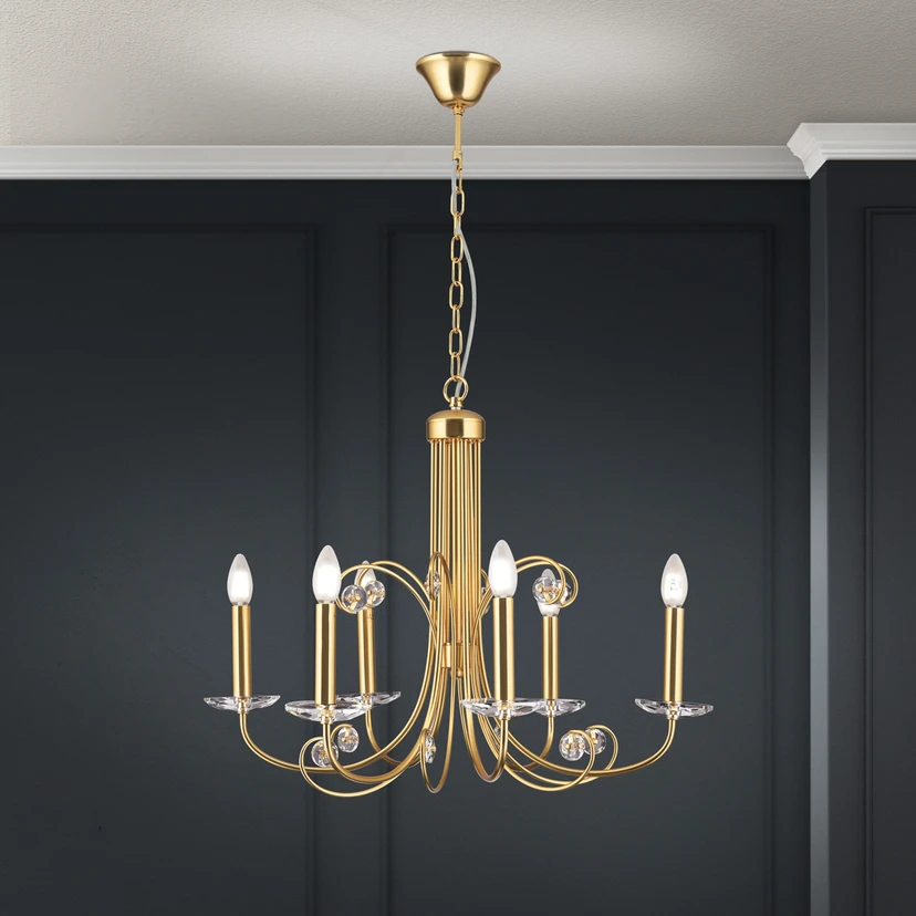Ariane lysekrone med 6 lyskilder og K9-krystaller Elegance og funktionalitet smelter sammen i Ariane lysekronen og skaber en imponerende belysningsoplevelse. Dette udsøgte møbel, fremstillet af stål i høj kvalitet og funklende krystalelementer, er et ægte blikfang i enhver stue eller spisestue. Med seks lyskilder giver Ariane lysekronen en afbalanceret lysfordeling, der skaber den rette atmosfære til både intime middage og livlige samtaler. Selvom der ikke følger en dæmper med denne model, kan lysstyrken justeres efter personlige præferencer ved at installere en ekstern dæmper. Dette gør Ariane lysekronen til et fleksibelt element i Raumgestalt, der ubesværet passer ind i det eksisterende interiør og skaber den ønskede stemning