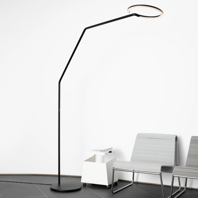 LED-gulvlampe Vine Light Office fra Artemide med lysdæmper og app-styring LED-gulvlampen Vine Light Office udsender varmt hvidt lys og kan justeres individuelt takket være dens led. Det minimalistiske armatur, som er baseret på en bueform, er udstyret med et cirkulært, næsten lukket armaturhoved i en smal form, hvor LED'er er installeret hele vejen rundt bag en diffusor, så der garanteres en homogen lysstråling. Hovedet er lavet af en speciel magnesiumlegering, der takket være sin lave varmeledningsevne tillader manuel justering af armaturhovedet, selv under drift. Tænding og dæmpning af lyset kan ske via touchdæmper direkte på armaturet eller via Bluetooth med Artemide-appen på tablet/smartphone. Designet af Vine Light Office LED-gulvlampen kommer fra Bjarke Ingels Group, en gruppe af arkitekter, designere og tænkere, der er aktive inden for arkitektur, byplanlægning, forskning og udvikling. De har arbejdet sammen med det italienske belysningsfirma Artemide i lang tid, og med designet af Vine Light-armaturserien knytter de an til Artemide-ikoner som Tolomeo, Demetra og andre med deres dristige design og sofistikerede funktionalitet.