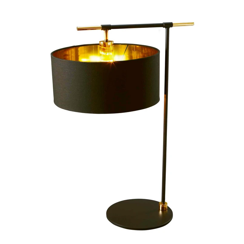 Balance bordlampe med stofskærm og filigran stel Balance er en dekorativ bordlampe med et filigran stålstel med en udkraget arm, hvorpå der er fastgjort en stofskærm, der peger nedad. Skærmen er lavet af stof på ydersiden og har en skinnende metallisk finish på indersiden, hvilket giver lampen et vidunderligt elegant og luksuriøst look. Lyset, der reflekteres på indersiden af skærmen, skaber en vidunderlig behagelig atmosfære i rummet.