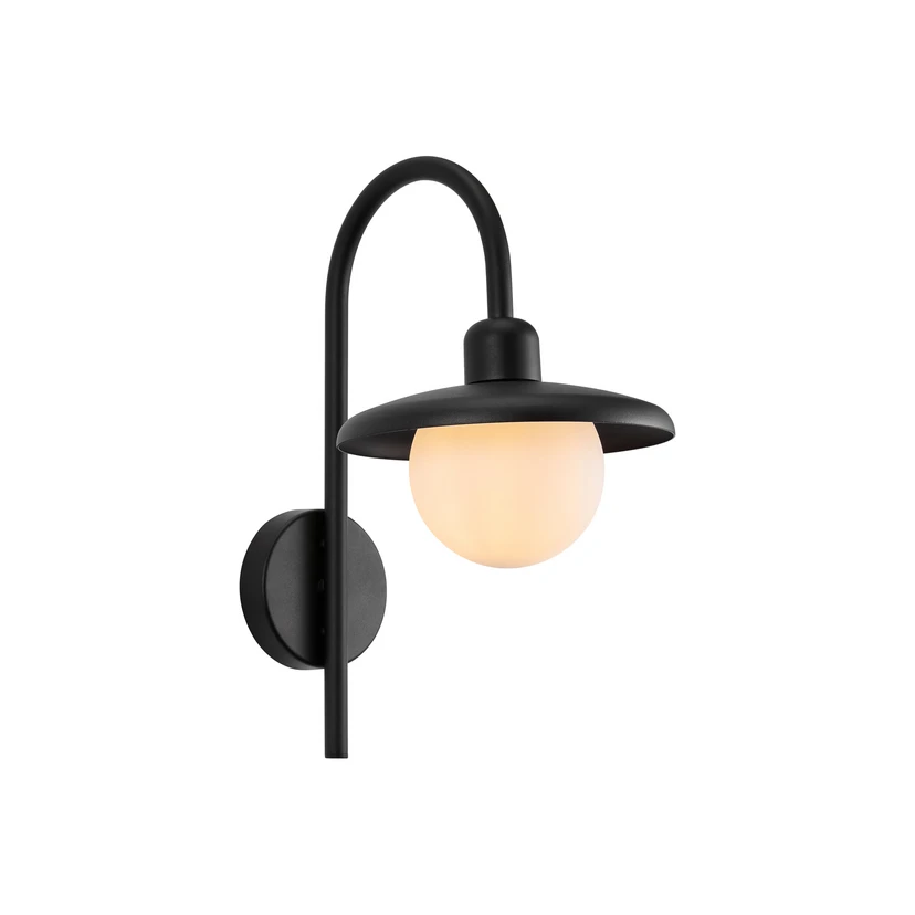 Berlo udendørs væglampe med buet arm og dobbeltskærm Berlo udendørs væglampe består af et rundt vægbeslag med en buet arm, der holder skærmen for enden. Den består af en sort, vidåben metalskærm og en kugle af opalhvid plast, der fungerer som diffusor og spreder lyset i alle retninger uden at blænde. Lyskilden (E27) medfølger ikke - Mulighed for parallel tilslutning