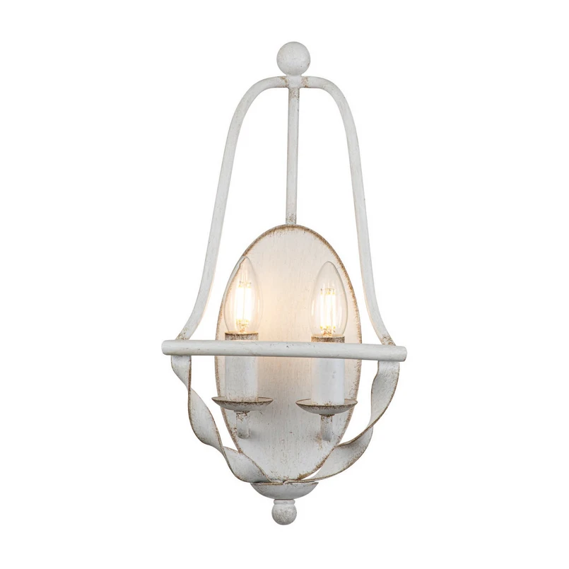 Bradbury-væglampe i antikhvid, to brændere Bradbury-væglampen i hvid tilfører en fascinerende atmosfære til ethvert rum. Med sine to flammer giver den et behageligt lys og skaber en hyggelig atmosfære i stuen, spisestuen eller soveværelset. Bradbury-væglampen er et ægte blikfang og forvandler ethvert rum på en inspirerende måde - Dæmpbar med ekstern lysdæmper og dæmpbare lyskilder