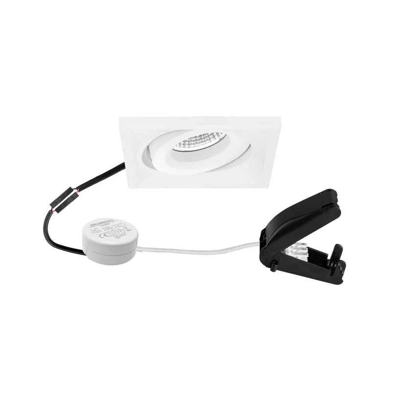 LED-indbygningsspot BB37 med rund LED-driver, dæmpbar og tilslutningsboks LED-indbygningsspot BB37, som kan drejes 20°, har en firkantet ramme og kan monteres i lofter med en tykkelse på op til 1,5 cm uden brug af værktøj ved hjælp af monteringsfjedre. Den leveres som et tilslutningsklart sæt til 230 V med en rund LED-driver, der kan dæmpes med en bagkantsfasedæmper (RC), og en tilslutningsboks. Det gode lysudbytte og den optimale lysfordeling garanteres af den sølvfarvede reflektor med rotationssymmetrisk, smalstrålende lysfordeling og den transparente polykarbonatafdækning - inkl. rund, elektronisk forkobling, bagkantfasedæmpbar - inkl. tilslutningsboks, 3-polet til gennemfortrådning - tilladt omgivelsestemperatur (ta): -20 °C - +25 °C - spot kan drejes 20° hele vejen rundt - maksimal loftstykkelse 1,5 cm