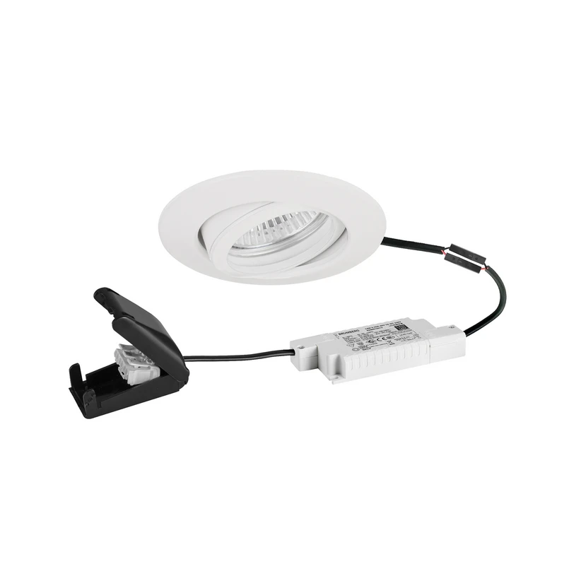BB13 rundt LED-indbygningsspotsæt med bagkantsdæmpbar driver (RC) og tilslutningsboks BB13 LED-indbygningsspotsættet består af et rundt LED-indbygningsspot, en LED-driver, der kan dæmpes med en bagkantsdæmper (RC), og en tilslutningsboks. Den runde downlight udsender varmt hvidt lys i en vinkel på 38°. Lyskeglen kan rettes i den ønskede retning ved at dreje spotlightet 25°. Hvis downlightet dæmpes med en ekstern bagkantsfasedæmper, skifter lysfarven takket være dim-2-warm-funktionen. Mens der ved fuld lysstyrke udsendes varmhvidt lys med en farvetemperatur på 3.000 K, reduceres farvetemperaturen ved det laveste dæmpningsniveau under dæmpningsprocessen til 1.800 K. - inkl. elektronisk forkobling, bagkantfasestyring (RC) dæmpbar - dim2warm-funktion - inkl. tilslutningsboks - sølvreflektor med rotationssymmetrisk dybstrålende lysfordeling - transparent glasafdækning - ingen afdækning med varmeisolerende materiale - maks. lofttykkelse 15 mm