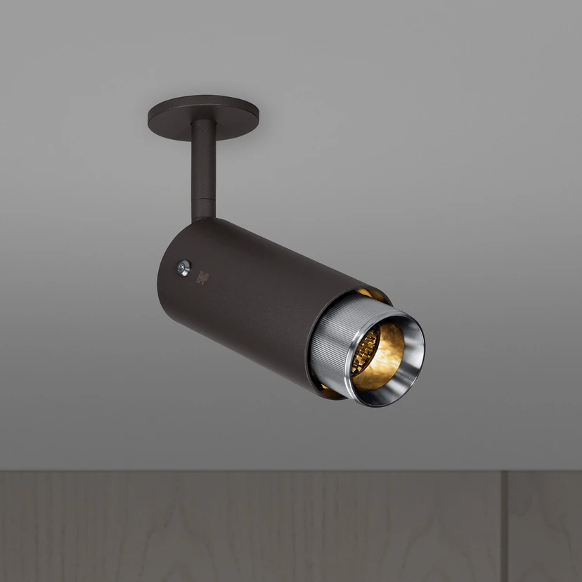 Det cylindriske, rustfrie stålhoved på Exhaust Spot loftspotlight sidder på et armbeslag, der gør det muligt at dreje og dreje det, så lyset kan rettes som ønsket. Lysudtaget indeholder et honeycomb-filter, der reducerer blænding. Desuden sørger en rillet, skråindstillet indsats for, at lyset er fokuseret.
