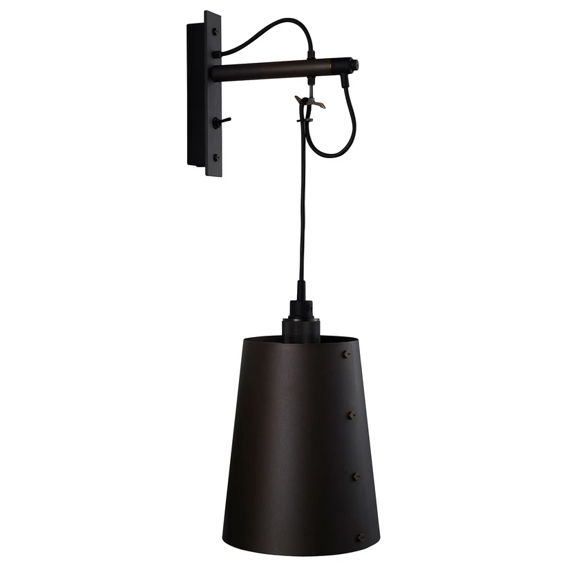 Hooked Wall large - væglampe i et individuelt design med metalskærm Det karakteristiske design gør Hooked Wall large-væglampen til et iøjnefaldende belysningsobjekt i ethvert rum. Med undtagelse af kablet er væglampen udelukkende lavet af metal. Skærmen og vægbeslaget er pulverlakeret i en farve; fatningen, krogen til ophængning af skærmen fra beslaget og de synlige skruer, der bruges til at fastgøre vægelementet og lukke skærmen, er lavet af metal i en kontrastfarve. En kontakt på vægbeslaget gør det muligt at tænde og slukke lyset direkte på lampen, og derfor kan Hooked Wall store væglampe også meget vel bruges på væggen ved siden af sengen som erstatning for natbordslampen. Hooked Wall store væglampe er fremstillet af Buster + Punch. Mærket blev grundlagt i London i 2013 af den anerkendte arkitekt og industrielle designer Massimo Buster Minale. Produktsortimentet strækker sig fra funktionelle armaturer til forskellige møbler og lamper. Producenten Buster + Punchs kærlighed til ædle, rene metaller afspejles i hvert eneste produkt.