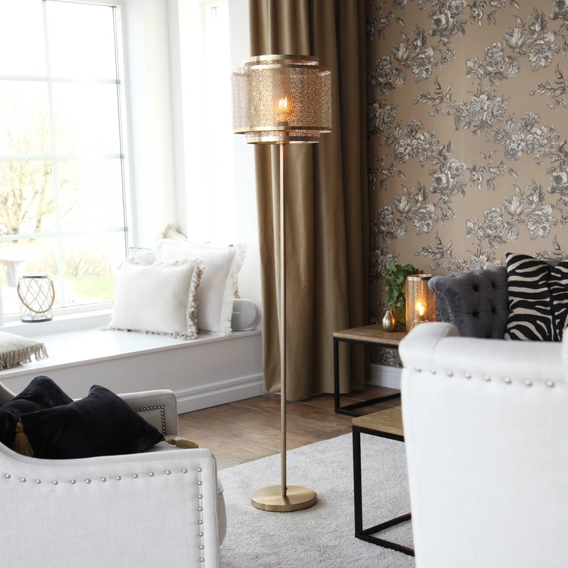 Hermine gulvlampen er lavet af metal med en mat messingfinish. Det giver en orientalsk atmosfære og giver en behagelig lys atmosfære. Lampeskærmen består af to cylindere med forskellige højder og diametre, der er forbundet med hinanden. Begge elementer er designet med et stjernelignende perforeret mønster og lader lyset skinne ind i rummet på en særlig effektiv måde. Lampeskærmen er støttet af en simpel stangkonstruktion på en rund lampefod. En E27-fatning giver plads til belysningsmidler efter eget valg.