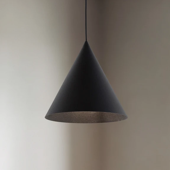 Konisk Cono-pendel i sort Skærmen på Cono-pendlen er lavet af stål i en tidløs konisk form og fås i mat sort. Lyset sendes nedad, hvilket gør pendlen ideel til bord- eller områdebelysning.