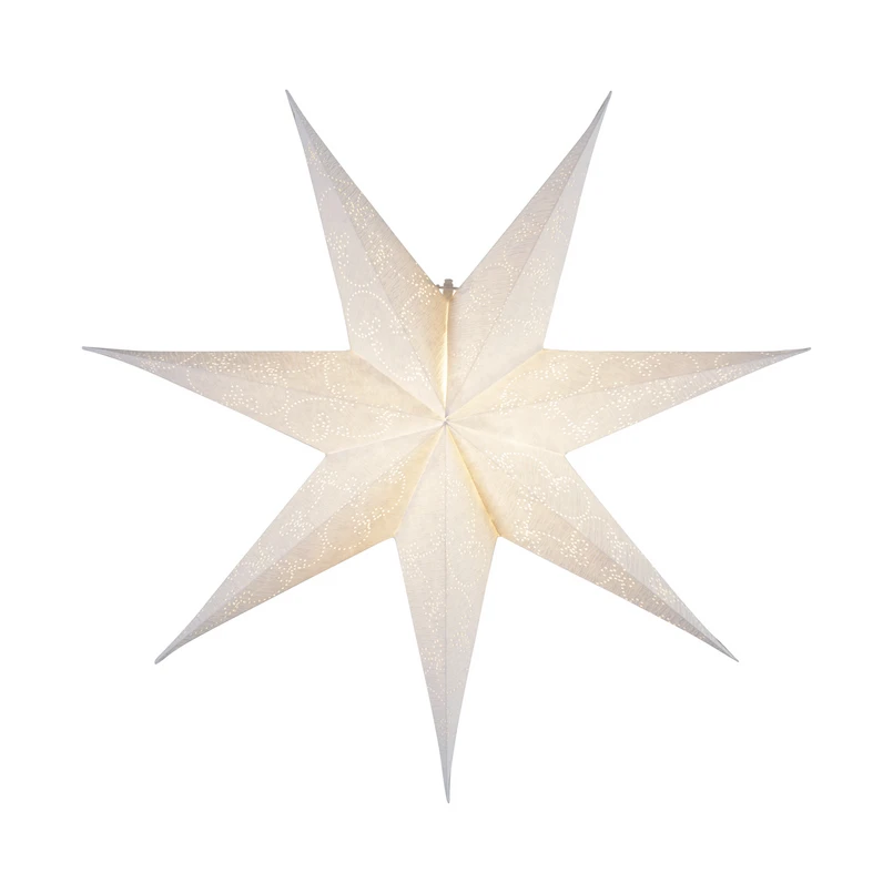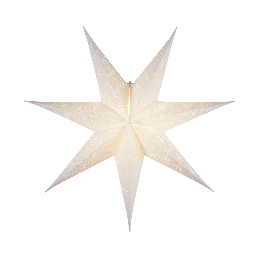 Decorus syvtakket papirstjerne: hvid/sølvPapirstjernen Decorus er designet i hvid med sølvspidser og giver et festligt præg til ethvert rum - uanset om den hænger frit eller i et vindue. Leveres uden lys, men hvis det ønskes, kan en LED-lysring til papirstjerner bestilles separat under tilbehør.