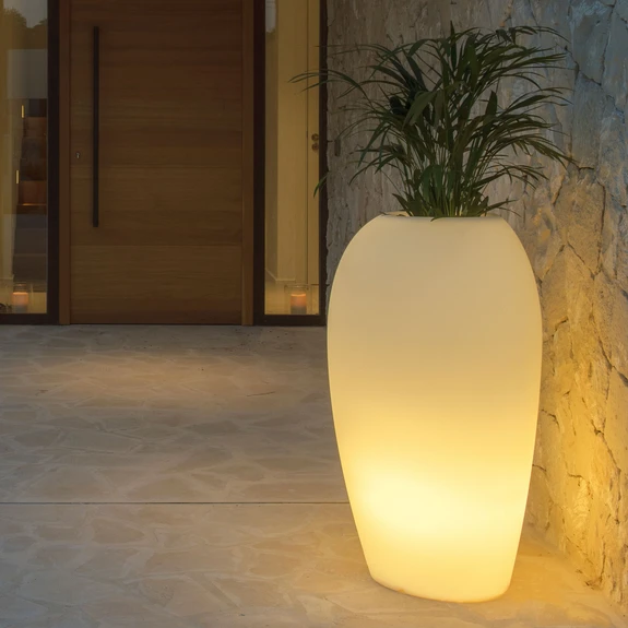Storus V er en del af den succesfulde dekorative belysningsserie fra Degardo®, en tysk producent med base i Bad Qeynhausen, som har skabt en dekorativ lampe med en form, der minder om en flodsten, der er lige så velegnet til at belyse stuen som til stemningsfuld belysning i haven eller på terrassen. Storus V, som er fremstillet af vejrbestandig, UV-resistent og slagfast plast (polyethylen), kan også udstyres med enten en planteindsats eller en dekorationsindsats, som begge kan købes separat som tilbehør. Indsatsen gør det lettere at plante og skifte plantepragt. Dekorationsindsatsen er også gennemskinnelig hvid. Når den fyldes med is, forvandler den Storus V til en stilfuld drinkskøler til havefester. Storus V er udstyret med innovativ LED-teknologi (RGB + CCT): Utallige farver kan styres via den medfølgende fjernbetjening, inklusive trendy pastelfarver, eller lyset kan skiftes til det hvide lysområde. Farvetemperaturen på det hvide lys kan således tilpasses individuelle behov: fra atmosfærisk varm hvid over hele spektret til meget lys dagslys hvid. En WiFi-controller fås som tilbehør, hvormed Storus V bekvemt kan betjenes via WiFi ved hjælp af en tablet eller smartphone efter download af den gratis app - dæmpbar