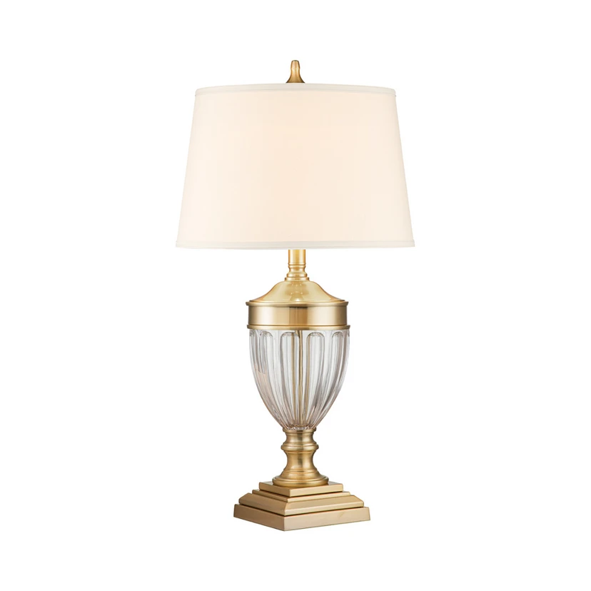 Nobelt udstyret bordlampe Dennison 1 med stofskærm Dennsion 1 er en lysspreder af behagelig ekstra belysning, der kan integreres optimalt i en klassisk atmosfære. Skærmen er lavet af fint hørstof og sidder på en ramme lavet af metal og glas, som vækker associationer til et trofæ. Udstyret med en afbryder på ledningen.