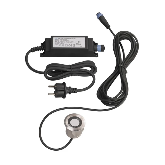 LED indbygningsspot sæt mini i rustfrit stål til udendørs brug - diffus lysudsendelse, kan udvides Sættet indeholder alle de nødvendige komponenter til at skabe attraktiv orienterings- eller accentbelysning i grønne områder, forhaver, terrasser, gangstier eller indkørsler. Den runde indbygningsspot består af et V4A-hus i rustfrit stål og en afdækning af hærdet, opalt sikkerhedsglas, som sikrer en diffus og bred udstråling (120°) af varmhvidt lys - Armatur med 5 m tilslutningskabel og 24 V-stik - Inkluderer 230 V til 24 V strømforsyningsenhed (maks. 20 W) med 1,5 m kabel og 230 V eksternt stik - Kan udvides med ekstra armaturer (se tilbehør) - Beskyttelsesklasse: IP68 - Slagfasthed: IK08 - God farvegengivelse: CRI > 90 - Kan bruges permanent under vand op til en maksimal dybde på 1 m - Omgivelsestemperatur under drift: - 25 °C til + 50 °C - Belastningskapacitet: maks. 3 t Bemærk: Den samlede effekt fra alle forbrugere, der er tilsluttet strømforsyningen, bør være ca. 10 % mindre end strømforsyningens nominelle effekt.