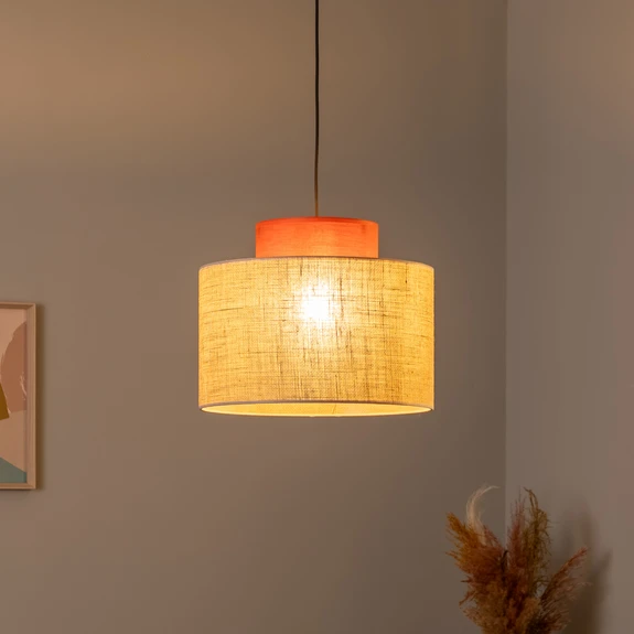 Hyggelig Duo-pendel med to-lags jute-tekstilskærm Duo-pendlen har en attraktiv stofskærm, der består af to cylindriske kugler i rustbrun og lys naturbrun. Ophænget med rund baldakin er i sort.
