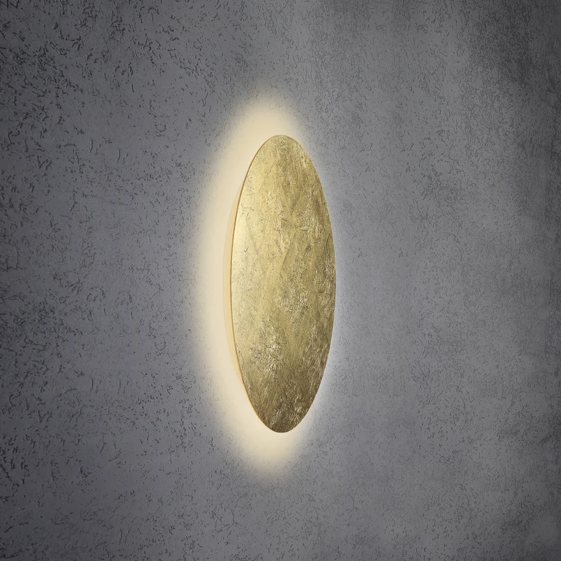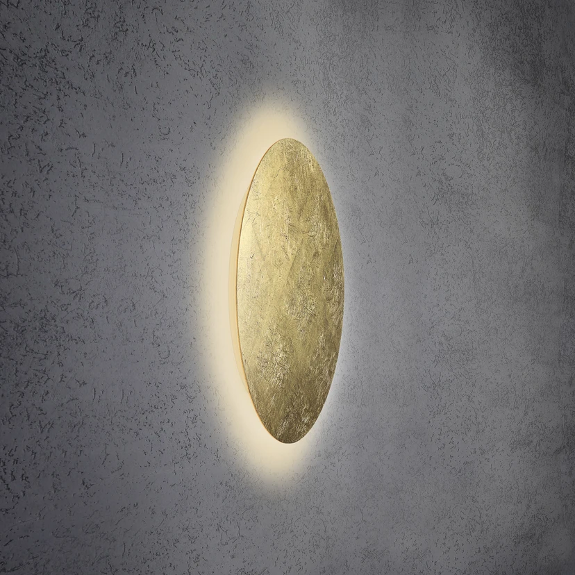 Den indirekte skinnende Blade væglampe er kendetegnet ved en behagelig lyseffekt og et moderne og værdifuldt udseende. Med sin uregelmæssigt strukturerede bladguldfinish tiltrækker armaturet fra producenten Escale straks opmærksomhed. Den cirkulære skive af aluminium dækker LED'erne på bagsiden, så deres varmt hvide lys kun udsendes i retning af væggen, hvor det skaber en diffus lyshalo omkring armaturet.