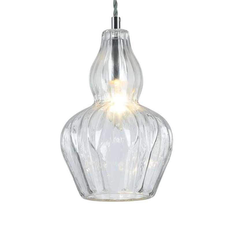 Uanset om det er monteret alene eller dekorativt i en gruppe, er den lille Eustoma- pendellampe en ægte blikfang med sin elegante glasskærm. Lampeskærmen er lavet af skåret glas - meget enkel, gennemsigtig og klar i sin farve. Her udsendes lyset forsigtigt nedad og gennem glasset ind i miljøet, hvilket skaber et meget behageligt omgivende og ekstra lys, der ser godt ud over borde, borde, kommoder eller skænke.