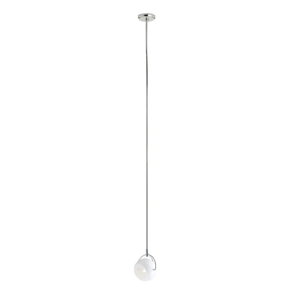 Det tynde beslag i blankt metal sikrer, at skærmen kan drejes og drejes, så lysemissionen kan justeres frit efter behov. Den sfæriske skærm med en rund åbning er lavet af hvidt, blæst glas og optager også beslagets glans. En G9-lampe kan bruges som lyskilde.