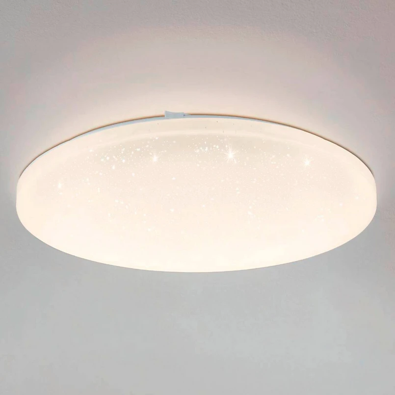Frania-S LED-loftlampe er en lyskilde til generel belysning, der kan bruges næsten universelt i alle rum og omgivelser.Loftselementet i lyset er lavet af stål, lampeskærmen er lavet af plast. Skærmen har en krystaleffekt, der næppe kan ses, når den er slukket. Så snart lampen er tændt, vises der dog en blinkende stjernehimmel på skærmen, hvorpå mindre og større stjerner glitrer som krystaller.