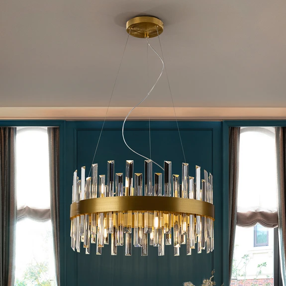 Grace-pendel med funklende glasstænger Den runde Grace-pendel består af en ring af børstet metal med en gylden finish, hvori de 14 G9-fatninger sidder. Klare glasstænger med en smuk slibning er forskudt rundt om denne ring, så de stikker op og ned fra ringen i to forskellige længder. De skaber en helt særlig lyseffekt og funkler i lyset. Ophænget består af tre filigrane stålkabler og en rund baldakin. De medfølgende LED-pærer sikrer en energieffektiv belysning.