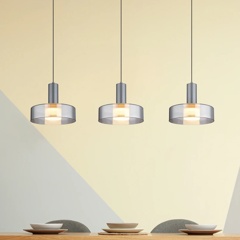 Grant hængelampe med 3 lyskilder: elegance møder energibesparende LED-teknologi Grant hængelampen kombinerer stilfuldt design med moderne funktionalitet. Den er fremstillet af en kombination af aluminium, metal, glas og akryl og har et imponerende udseende, der sætter accenter i ethvert rum. Det røggrå glas giver lampen en tidløs elegance, som kan integreres problemfrit i forskellige indretningsstile. Med tre lyskilder er den ideel til at oplyse opholds-, spise- og køkkenområder. Grant-pendlen er udstyret med en integreret LED-hængelampe og giver et varmhvidt lys, der har en meget stemningsfuld effekt. Denne energibesparende belysning skaber en behagelig atmosfære, der er velegnet til både afslapning og arbejde. De permanent installerede LED'er garanterer en lang levetid og reducerer vedligeholdelseskravene betydeligt. Et perfekt samspil mellem design og effektivitet, der forbedrer ethvert rum.