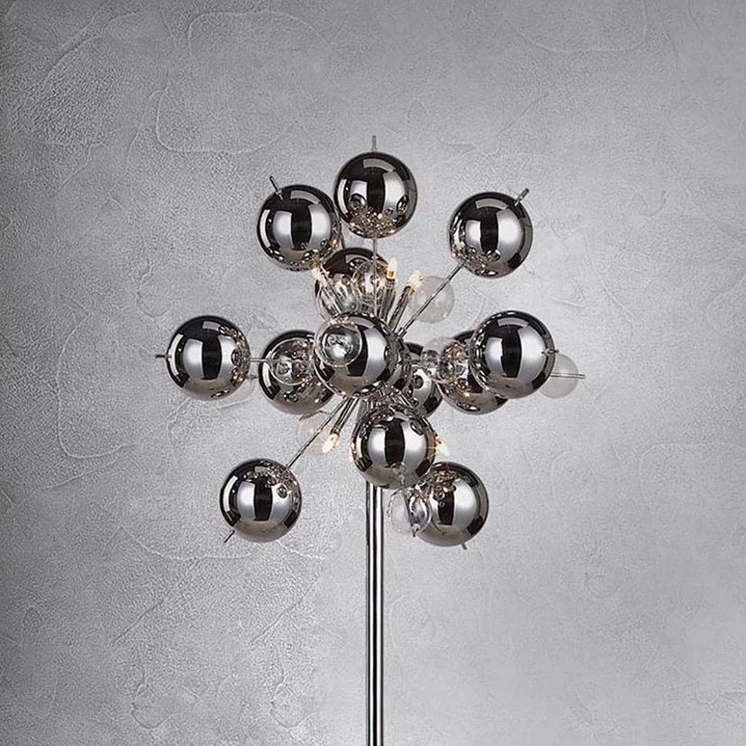 Strålende gulvlampe Wakusei i flot design Usædvanligt design og fleksibel belysning - det er den unikke gulvlampe Wakusei, som består af en enkel metalramme og mange forkromede metalkugler og klare glaskugler på individuelle stivere. Ti halogenlamper er fordelt mellem de skinnende kugler og får dem til at funkle i lyset. Lysdæmperen, der er indbygget i forsyningskablet, gør det muligt at justere lysintensiteten, så den passer til enhver situation. Den dekorative gulvlampe Wakusei med sin moderne effekt er udstyret med et 2 m langt forsyningskabel.