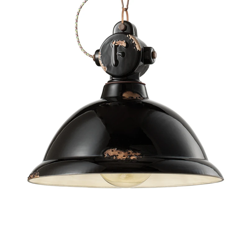En rustbrun metalkæde rummer en stor, kuppelformet skygge lavet af keramik med en enkeltfarvet lakbelægning. En målrettet, ujævn applikation skaber indtryk af tegn på slid. Den øverste del af skyggen, der fungerer som holder til kæden og kablet, har en stor "F", som står for den italienske Ferroluce .