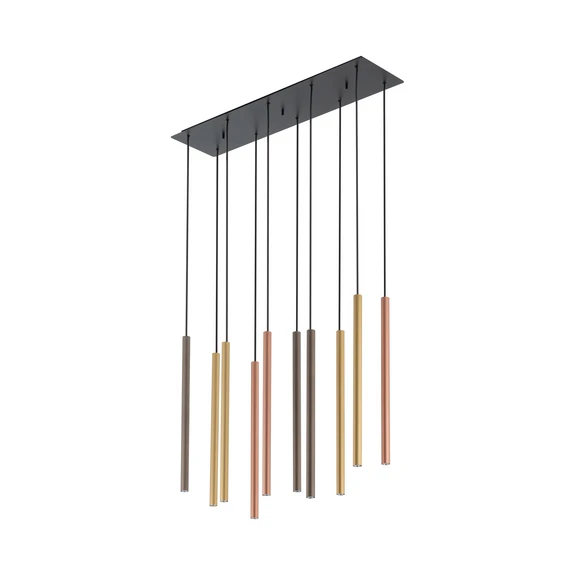 Hængelampen Laser, fremstillet af højkvalitetsstål, forener moderne design med en fascinerende farvepalet i guld, kobber og brun. Denne lampe med 10 lyskilder er et blikfang i ethvert rum og er ideel til stuen, spisestuen og køkkenet. Det flerfarvede design skaber en inspirerende stemning, der ændrer rummets atmosfære på en unik måde.