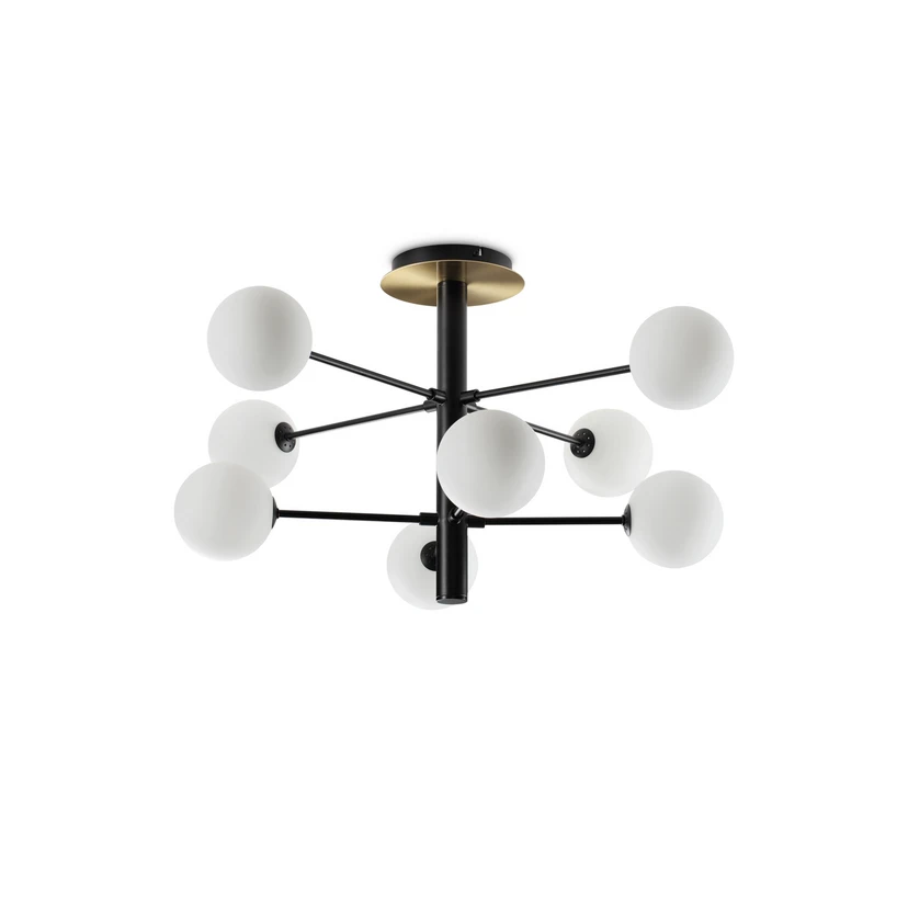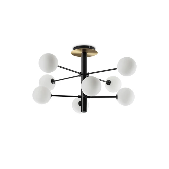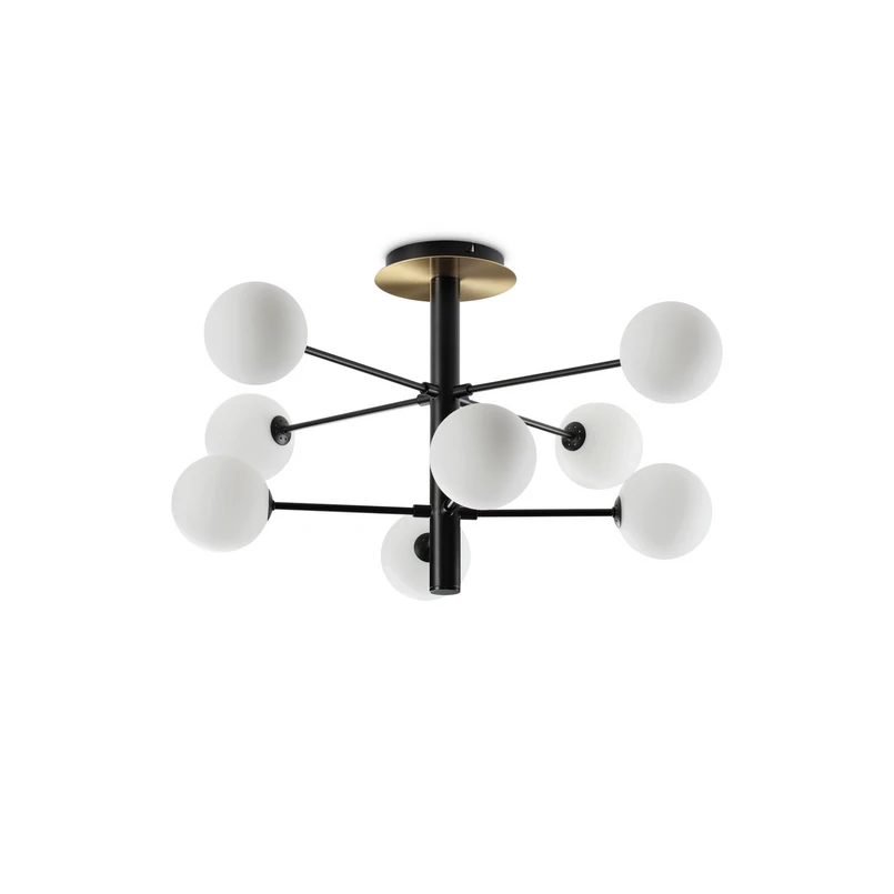 8 lyskilder Cosmopolitan loftlampe i sort med opale glaskugler Cosmopolitan loftlampen er kendetegnet ved et eksklusivt design og en spotlight smuk lyseffekt. De otte kugleformede lampeskærme i opalglas, som er fastgjort til den forgrenede, sorte metalramme, spotlighter blidt det varmhvide lys fra de medfølgende G9 LED-pærer til alle sider. Der er også en messingfarvet detalje på baldakinen.