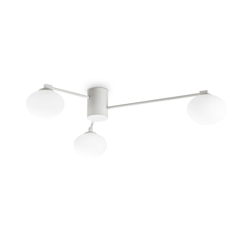 Hermes loftlampe med tre runde lampeskærme i opalglas Hermes loftlampen er en elegant lyskilde, der harmonerer med mange indretningskoncepter i både private boligområder og prestigefyldte offentlige rum. Tre linseformede, opale glasskærme er monteret under metalstrukturen med en cylindrisk baldakin og tre arme, der strækker sig vandret udad. Varmhvide G9 LED-pærer er inkluderet.