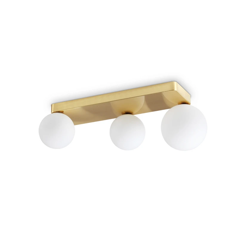 Penta loftlampe med guldfarvet fatning og tre kugleformede opalglasskærme Den 3 lyskilder store Penta væglampe fylder stuer og opholdsrum med behageligt lys og elegant flair. Den rektangulære baldakin i aluminium har en gylden finish. De tre lampeskærme af opalglas har form af kugler i forskellige størrelser og udsender det varmhvide lys fra de medfølgende G9 LED-pærer homogent på alle sider.
