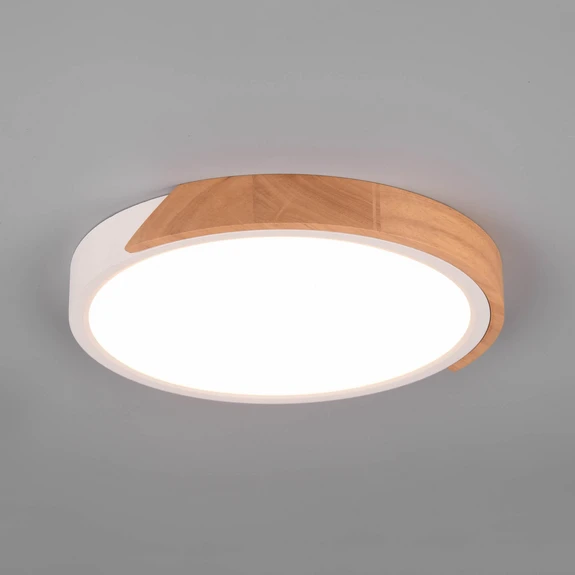 Rund LED-loftlampe Jano med trædetalje - dæmpbar i tre trin via vægkontakten