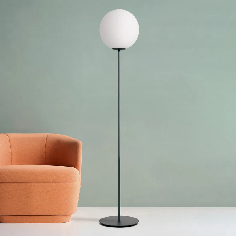 Dæmpbar, sort gulvlampe Jugen med en kugleformet skærmGulvlampen Jugen har et enkelt og moderne design. Den slanke, sorte metalstang og den runde, hvide kugleformede skærm har en behagelig klassisk effekt og er en ægte berigelse i stuen. Nederst afsluttes lampen med en rund fod. Lampeskærmen er lavet af blæst matteret glas og giver en behagelig og blød lysatmosfære. Med den indbyggede lysdæmper giver gulvlampen høj komfort ved valg af lysstyrke med en matchende, dæmpbar E27-pære (se tilbehør).Denne lampe kommer fra Miloox-produktlinjen fra Sforzin, som er kendetegnet ved usædvanligt frisk design og kombinationen af trendy materialer.