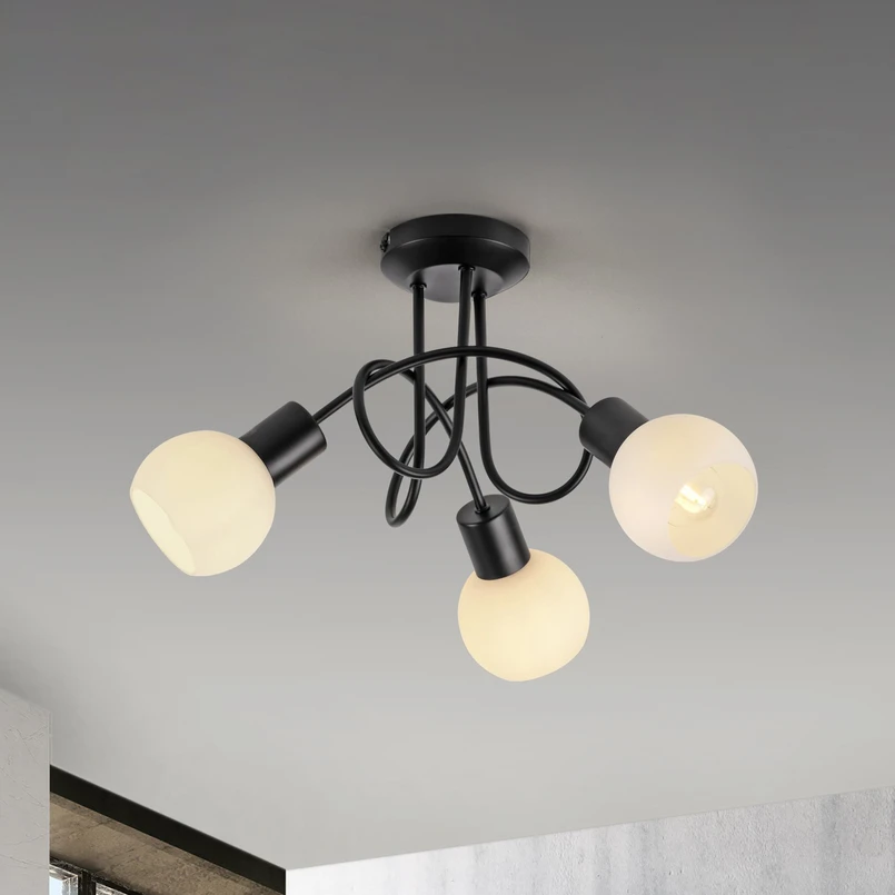 Loki loftlampe af jern og glas, 3-lampet med E14 LED-pærer Den 3 lyskilder Loki loftlampe består af en sortlakeret jernramme med sammenflettede arme, hvorpå der sidder tre næsten sfæriske glasskærme og er en allrounder til mange områder i hjemmet. LED-pærer med E14-sokkel og varmhvid lysfarve medfølger og kan udskiftes.
