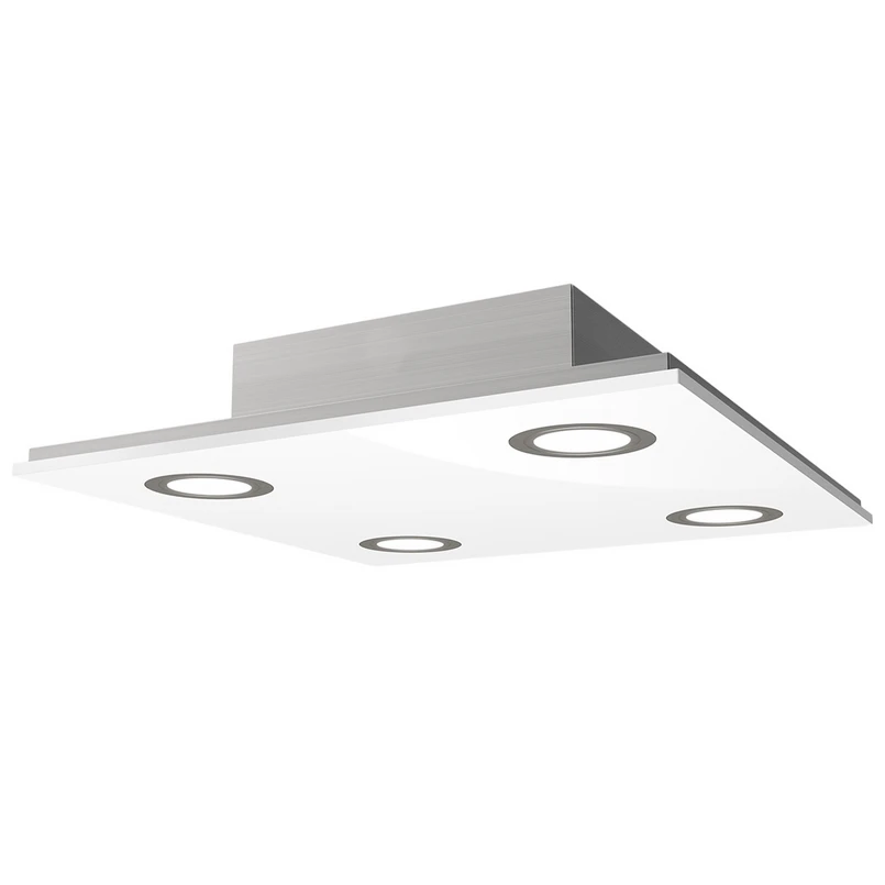 I den kvadratiske plade i rustfrit stål med akrylafdækning, er der indbygget fire varmhvide LED-spot. LED'erne i loftlampen Pano sørger for en blændfri, homogen og dermed ensartet belysning. Anvendelsesmulighederne for denne moderne lampe er meget alsidig, takket være dens diskrete design og tidløse farveskema. I alle rum vil Pano sørge for den nødvendige generelle belysning - og det endda på en meget energieffektiv måde.