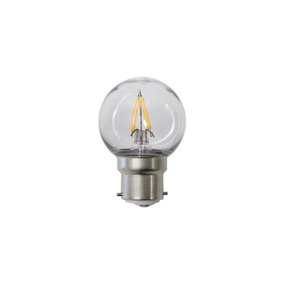 Klar B22 LED-lyskilde, miniglobe G45, 1 W, varmhvid Denne varmhvide 1 W LED-pære med B22-sokkel er støbt som en G45-miniglobe med en klar pære af brudsikker PVC. LED'erne er arrangeret i et glødetrådslook.