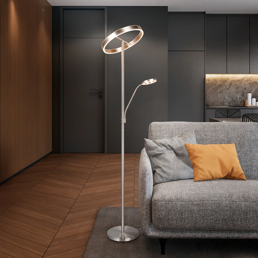 Moderne Willis LED-gulvlampe med læselampe, sensordæmper og CCT-funktion Willis LED-gulvlampe af metal er en moderne og alsidig lyskilde. Hovedlyskilden er placeret i det ringformede, sideværts vipbare hoved og giver direkte og indirekte belysning. Der er også en læselampe på stellet, som kan justeres frit takket være en fleksibel arm. Begge lyskilder kan tændes separat. Lysstyrken kan justeres ved hjælp af en sensordæmper, og der er også en CCT-funktion til styring af farvetemperaturen i tre trin.