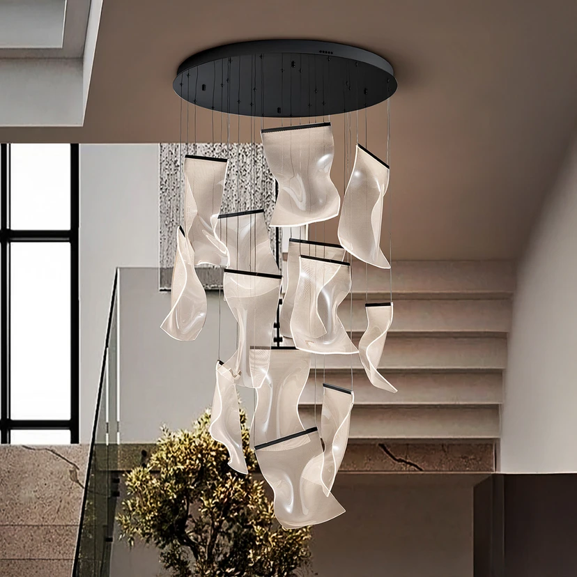Velos II LED-hængelampe i et usædvanligt design Velos II LED-hængelampen fanger øjet med sit specielle design og giver varmhvid, effektiv belysning. Armaturets 13 skærme er lavet af mikroprintet methacrylat og ligner sarte stof- eller folielængder, der bevæger sig i vinden. Baldakinen og holderne til skærmene er lavet af metal og har en matsort finish. Lyset er et designelement, som er en stilfuld tilføjelse til enhver stue eller spisestue. De permanent installerede LED'er spotlighter et varmhvidt lys, der skaber en behagelig atmosfære. Det mulige ophæng på op til 300 cm gør også armaturet perfekt til brug i åbne gallerier eller trappeopgange. Armaturet er udstyret med en triac eller 0-10V dæmpbar LED-driver, så det kan dæmper ved hjælp af en ekstern lysdæmper. Der medfølger også et dæmper-sæt.