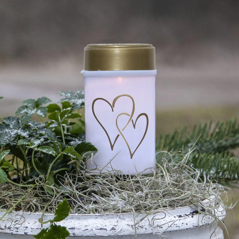 Hearty LED-gravlys med skumringskontakt og jordspyd Hearty er især beregnet til gravudsmykning. Det cylinderformede LED-gravlys er udformet som et klassisk gravlys med en krop af plast og et guldfarvet låg. Motivet af gyldne hjerter pryder ydersiden. Det stænktætte (IP44) LED-gravlys kan bruges permanent udendørs og er nemt at sætte fast takket være jordspyddet. Den drives af solceller og et genopladeligt batteri (medfølger). Den integrerede dagslyssensor muliggør automatisk skift baseret på den omgivende lysstyrke.